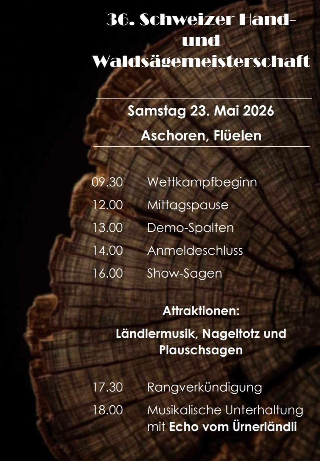23. Mai 2026: Schweiz. Hand- und Waldsägemeisterschaft Flüelen Infos